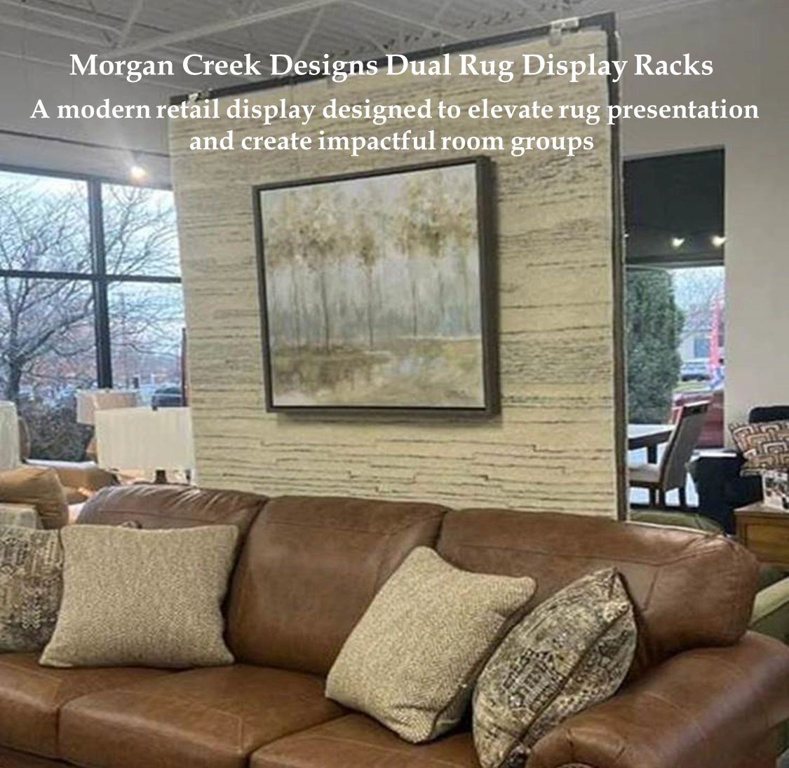 Morgan Creek Area Rug Display Racks Make it easy for your customers to view and feel the quality of your area rugs. Our Displays are built 58" wide to conceal the frame within the confines of the rug being displayed our racks are also adjustable to 100" tall to accommodate Rugs 5'x7' and 5'x8' each Rack is designed to be functional yet simple with fast assembly and setup allowing you more sales floor space along with creating system to feature accent rugs that coordinate with each room group.
